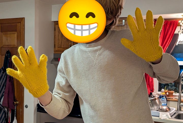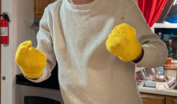 Those little knit mice? Of course I’m not going to get them done in time for Christmas this year. But knitting tiny animals did make it easier to knit fingers for the yellow gloves my son requested: