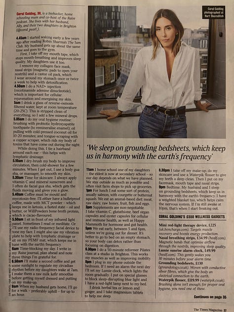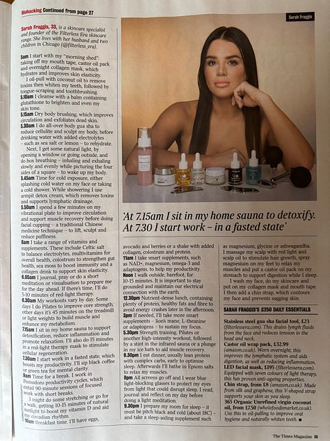 Recently on Bluesky someone posted a few photos of an article from The Times magazine of the alleged daily routines of these nutty women who apparently not only plan their days to the minute but also have very elaborate and complicated beauty and health rituals: